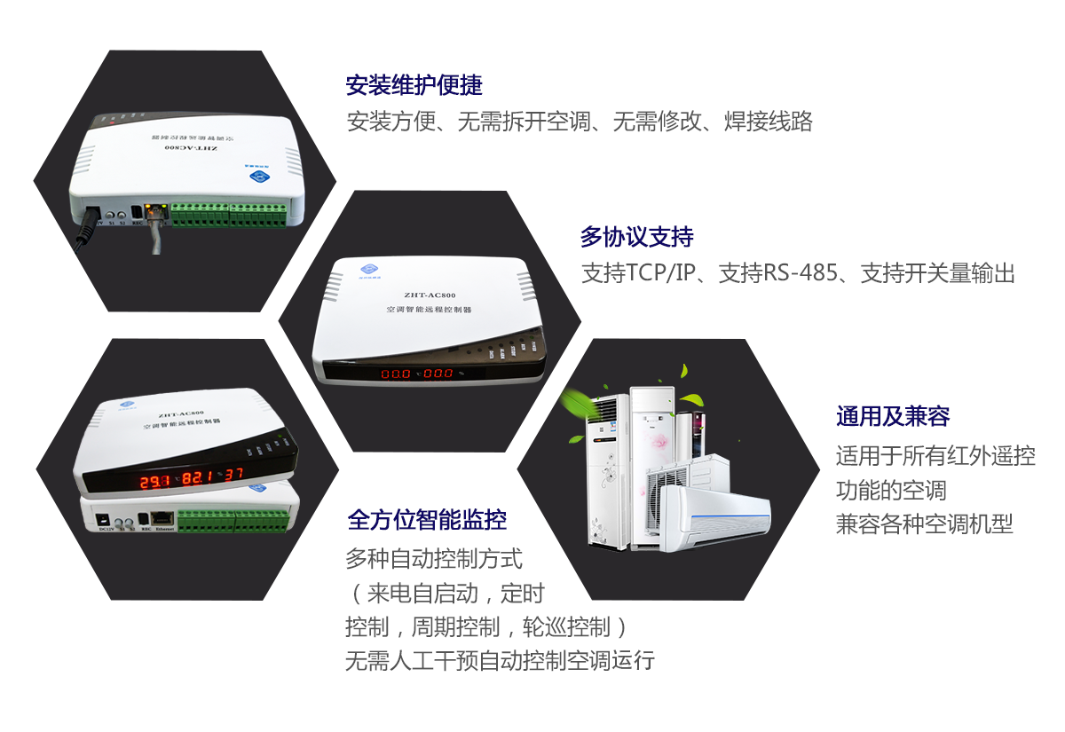 ZHT-AC800 網(wǎng)絡(luò)型空調(diào)智能啟動控制器,利用 PC 機控制軟件,通過網(wǎng)絡(luò)或 RS485 與設(shè)備進行通訊,可實現(xiàn)上百臺空調(diào)的集中聯(lián)網(wǎng)控制。通過學(xué)習(xí)空調(diào)遙控器的空調(diào)的開啟和關(guān)閉、工作模式、溫度調(diào)整等紅外信號,實現(xiàn)空 調(diào)斷電再來電自動啟動,并開啟到用戶需要的運行模式,同時具備溫度檢測控制功能,按用 戶配置的溫度值,當(dāng)環(huán)境溫度達到設(shè)定值后,自動開啟和關(guān)閉空調(diào),兼容市面上各種品牌柜式機、分體壁掛機、吸頂式機等各 種空調(diào)機機型。