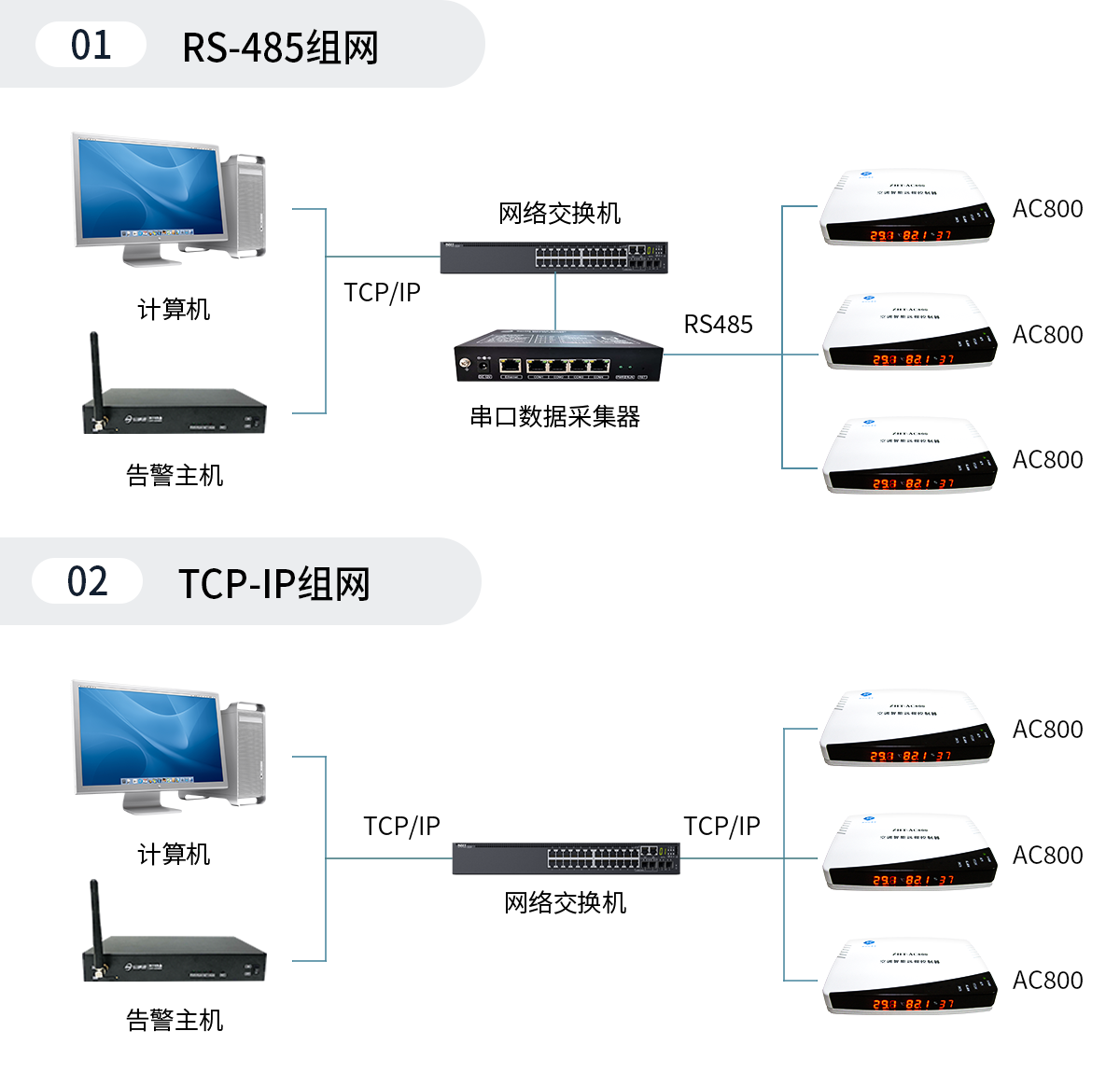 ZHT-AC800 網(wǎng)絡(luò)型空調(diào)智能啟動控制器,內(nèi)置網(wǎng)絡(luò)及RS485通訊接口,可使用TCP/IP組網(wǎng)和RS485總線連接方式組網(wǎng),可根據(jù)空調(diào)現(xiàn)場的位置分布靈活選擇組網(wǎng)方式,實現(xiàn)遠(yuǎn)程集中管理所有空調(diào)。其系統(tǒng)組網(wǎng)圖如左圖所示。