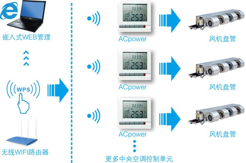 ZHT-ACpowe中央空調(diào)智能溫控器配備LCD 屏幕, 內(nèi)置嵌入式WEB,使用WIFI通信,通過告警度數(shù)字型溫度傳感IC 檢測室內(nèi)溫度,并實時與用戶設(shè)定溫度進行比較,自動調(diào)節(jié)風機的風量和開、關(guān)管道電動 閥,達到維持室內(nèi)恒溫的目的。風速控制分為自動、高、中、低四檔,可現(xiàn)實當前工作 模式、實時溫度。適用于中央空調(diào)及采暖或制冷系統(tǒng)的風機盤管、電熱器、熱泵機組等溫度控 制系統(tǒng)的用戶,如酒店、寫字樓等場所。